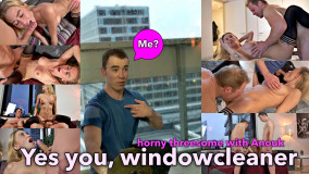 Anouk wordt door haar vriend de kamer ingedragen. Ze ziet er geil uit in haar lingeriesetje en haar vriend bespringt haar dan ook vol passie. Midden in de kamer, op de eettafel. Ze geilen elkaar tot het uiterste op, totdat Anouk ziet dat de glazenwasser op het terras naar binnen staat te turen. Het schouwspel heeft hem niet koud gelaten en Anouk heeft best zin in een triootje. Ze wenkt hem binnen. Eerst kijkt de glazenwasser even vol ongeloof, maar dan waagt hij zich naar binnen en haalt gelijk zijn lul uit zijn broek. Anouk wil die pik maar al te graag in haar warme geile monde voelen. Niets dan geile actie! Heerlijk!