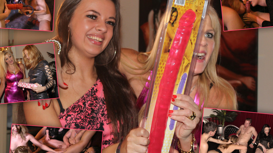 Kim Holland's staff party gets more and more spontaneous, and once the presents are unwrapped the girls discover not only the dildos, but also the fruit bowl and each other! The champagne flows profusely and the girls' juices literally flow down their beautiful long legs. The temperature is rising, the horny smell of sex is in the air and waiting for an explosion of licking, sucking and fucking pleasure. Go watch NOW and don't miss the continuation of this blood-hot party!